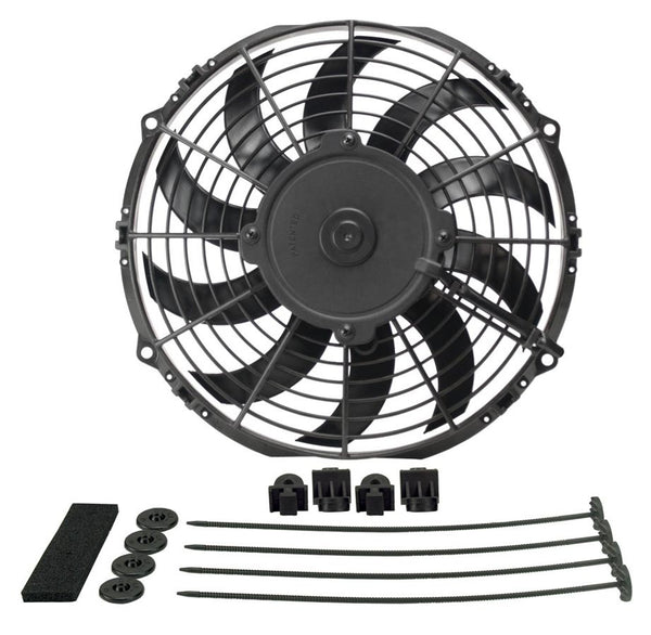 Electric Cooling Fan - High Output - 10 in Fan - Puller - 802 CFM - 12V - Curved Blade - 11-1/8 x 10-1/2 in - 2-1/16 in Thick - Install Kit - Plastic - Kit