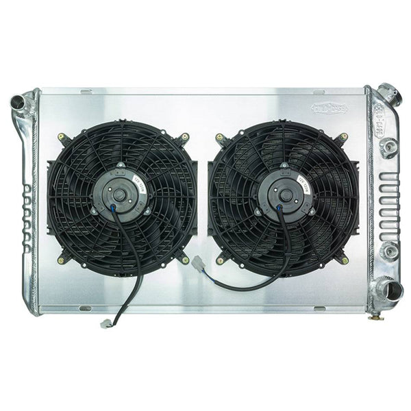 Radiator and Fan - 32 in W x 18.5 in H x 3 in D - Driver Side Inlet - Passenger Side Outlet - Aluminum - Polished - Automatic - GM G-Body 1984-87 - Kit