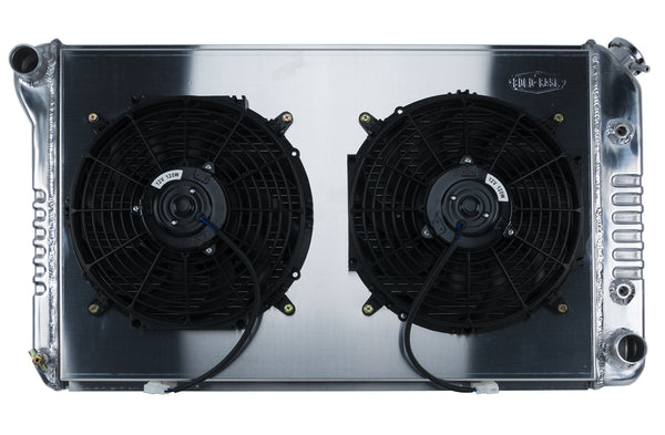 Radiator and Fan - 33.2 in W - 18.8 in H - 3 in D - Driver Side Inlet - Passenger Side Outlet - Aluminum - Polished - Automatic - GM F-Body 1970-81 - Kit